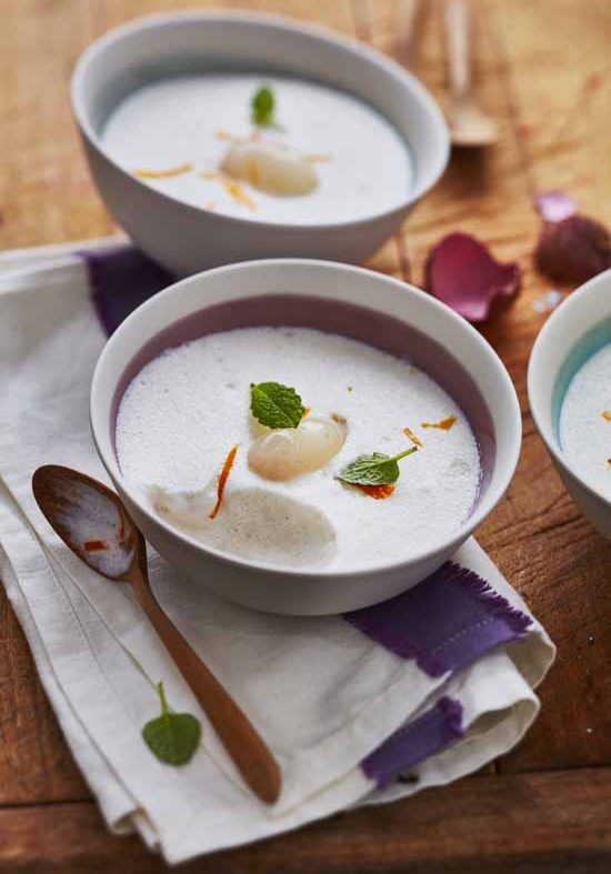 - Décorer les mousses de morceaux de litchi, de feuilles de menthe et de zestes d’orange juste avant de servir.