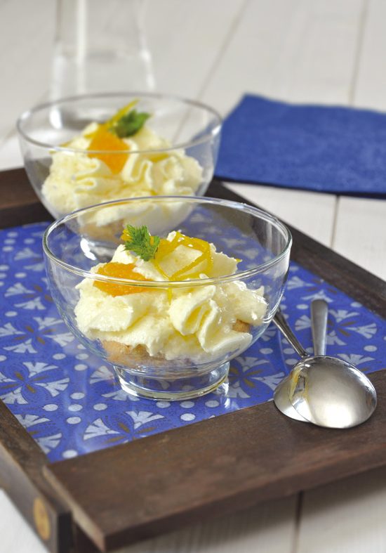 - Pour le montage, déposer dans chaque verrine un demi-biscuit, un nuage de mousse de mascarpone à l’orange.
