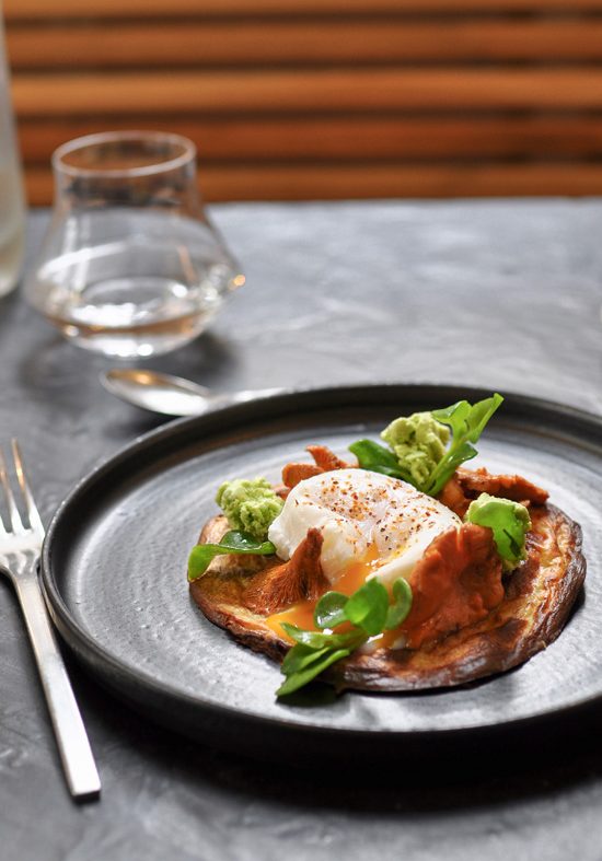 Oeuf poché sur une crêpe vonassienne, girolles, pleurotes et glace à l’ail des ours