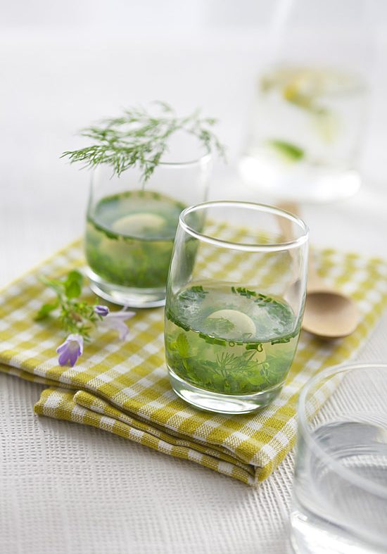 - Laver, sécher et ciseler les herbes. Dans une casserole verser l'eau et porter à ébullition. Y plonger les herbes. Laisser infuser à feu doux. Presser la gélatine dans les mains puis la déposer dans la casserole pour la faire fondre. Laisser tiédir puis verser dans chaque verrine (de façon à couvrir entièrement l'œuf). Laisser refroidir puis placer au frais pour 2 heures de prise au froid.