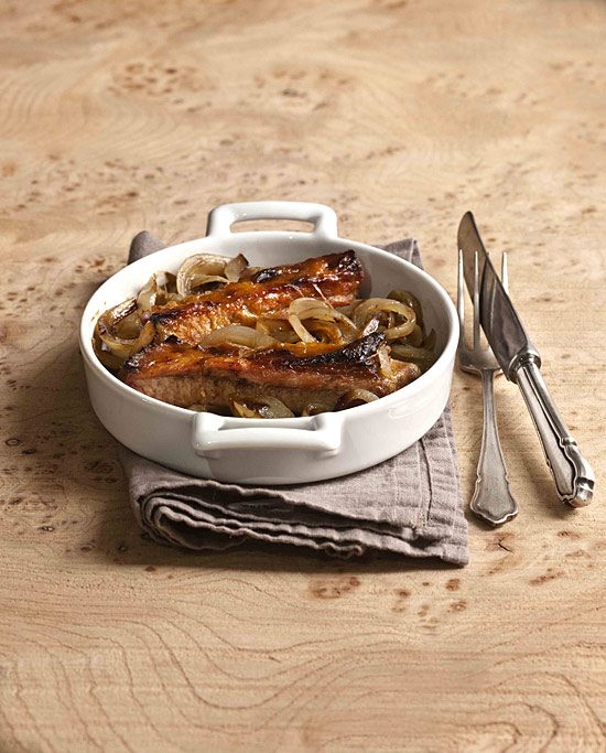 - Tapissez un plat avec les oignons confits au cidre et déposez dessus les travers badigeonnés.