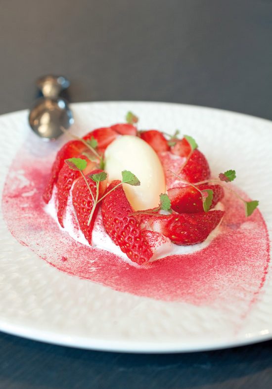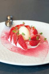 - Laver, sécher et couper les fraises en 4 et monter comme un fraisier : déposer au centre de l’assiette la crème vanillée au kirsch et intégrer les fraises.