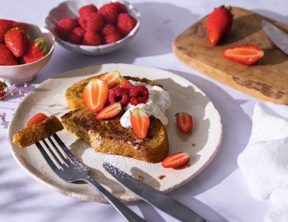 - Tremper le pain dans l’appareil à pain perdu puis les faire dorer sur les deux faces, avec un peu d’huile d’olive, dans une grande poêle antiadhésive.