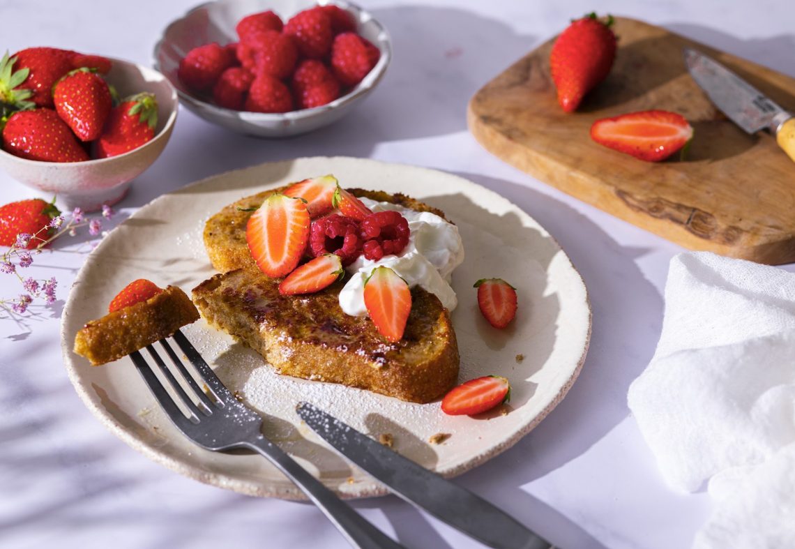 - Dans une poêle chaude, faire fondre une noisette de beurre et faire cuire les tranches de pains quelques minutes de chaque côté, en les saupoudrant de sucre glace pour qu’elles caramélisent légèrement.