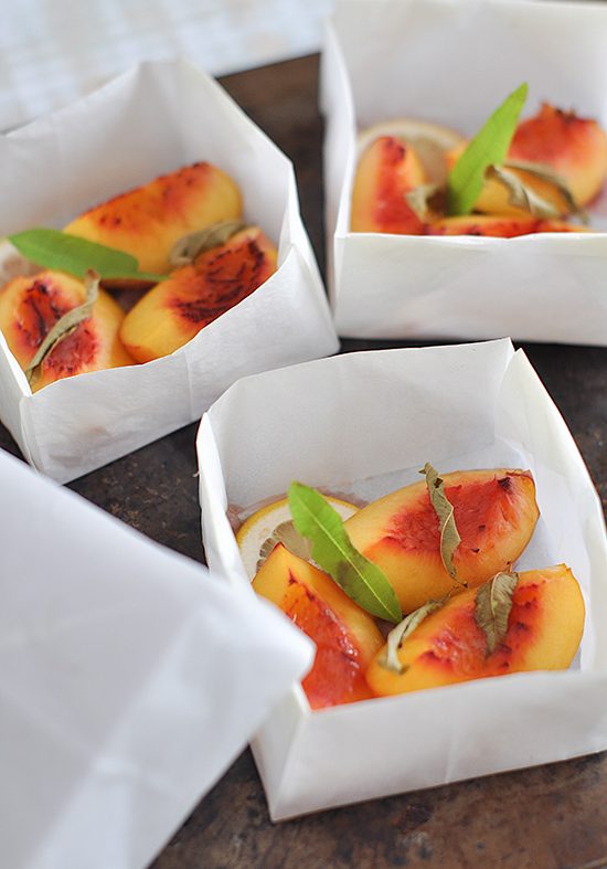 - Découper 4 feuilles de papier sulfurisé. Au centre de chaque feuille, déposer une ou deux rondelles de citron et deux moitiés de pêche. Arroser de sirop d’agave et parfumer de feuilles de verveine.