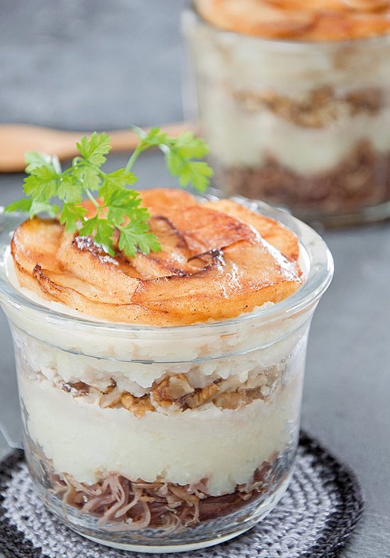 - Monter le Parmentier : répartir successivement sur le canard effiloché une couche de purée de céleri, une couche de noix hachées, à nouveau de la purée de céleri et terminer par les pommes poêlées.
