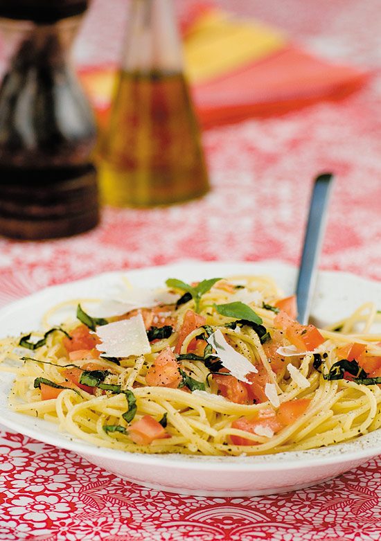 - Egoutter les pâtes et verser dessus la préparation tomate-basilic. Mélanger et servir de suite (attention : les pâtes refroidissent vite). Mettre à disposition un petit pot de parmesan râpé dont chaque convive se sert à sa convenance.
