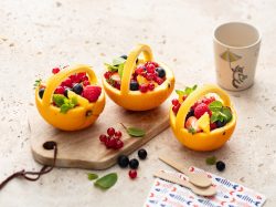- Découper les fruits rouges selon leur grosseur et garnir chaque panier de fruits rouges et d’orange. Terminer par quelques feuilles de menthe et entreposer au frais.