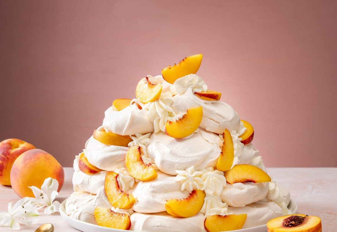 Pièce montée de pavlova aux pêches et aux nectarines, Chantilly vanillée