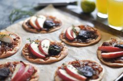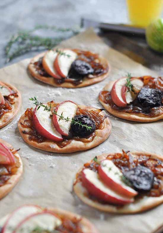 - Déposer sur chaque disque de pâte un peu d’oignon, quelques quartiers de pomme, et quelques rondelles de boudin noir.