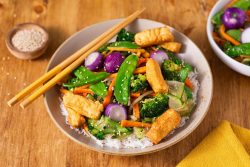 - Servir les légumes sautés sur une couche de riz et accompagnés de beignets de tofu.