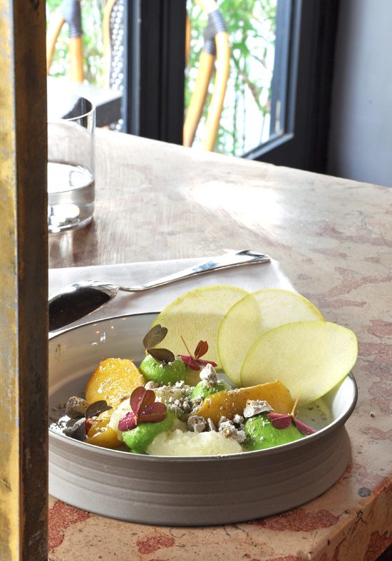 - Dans une petite assiette creuse, disposer 3 quartiers de pommes rôties, 3 quenelles de sorbet, 3 touches d’oseille en siphon et pour finir, parsemer de meringue brisée.