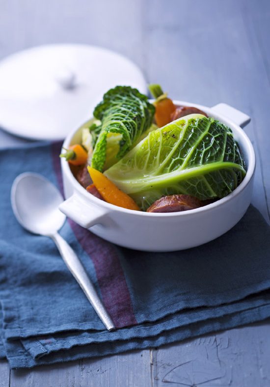 - Laver et parer le chou vert. Le couper en quatre et plonger les morceaux dans une marmite d'eau bouillante salée pendant 10 à 15 min. Ajouter les saucisses de Morteau. Retirer le chou puis le passer sous l'eau froide pour stopper la cuisson et l’égoutter.
