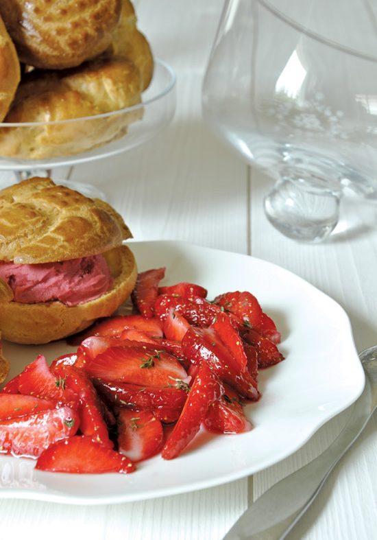 Profiteroles aux fraises confites et sorbet fraise-thym citron