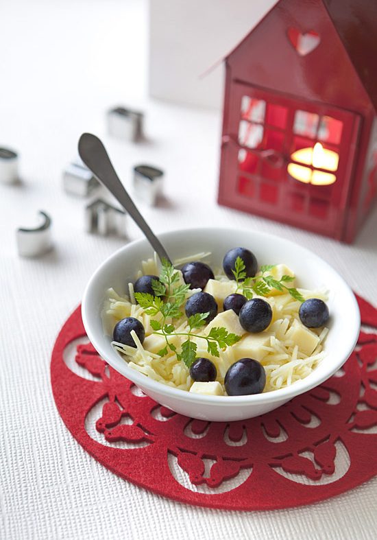 - Coupe le fromage en fines lamelles (ou en cubes, comme tu préfères) et dépose-les sur la salade puis mélange.