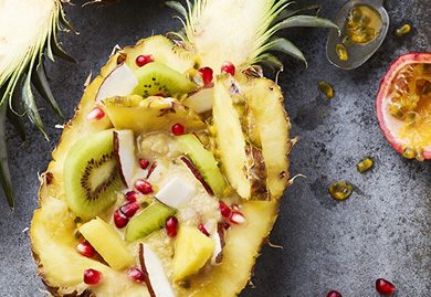 Zéro gaspillage : lavez soigneusement les morceaux d’écorce d’ananas et mettez-les dans une casserole avec 400 ml d’eau et 50 g de sucre. Portez à ébullition 15 minutes, puis laissez refroidir avant de filtrer. Ce jus très parfumé remplacera le jus d’ananas de la recette.