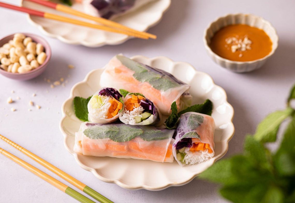 - Servir immédiatement les rouleaux, accompagnés d’une sauce cacahuètes ou nuoc mam.