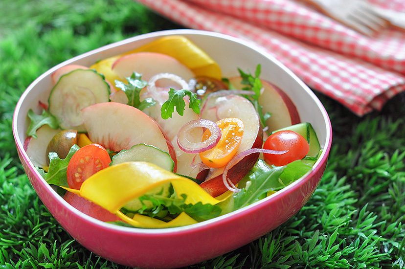 - Dans un saladier, déposer les rubans de courgette, les tomates cerise coupées en deux et les quartiers de nectarine.