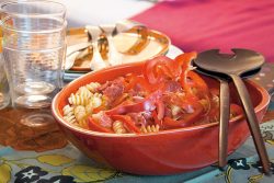 - Laver et tailler finement le poivron. Couper le jambon en fines lanières. Préparer la vinaigrette dans le fond du saladier (sel, vinaigre, puis huile et paprika). Verser dans le saladier les pâtes, le poivron et le jambon cru. Bien mélanger avant de servir