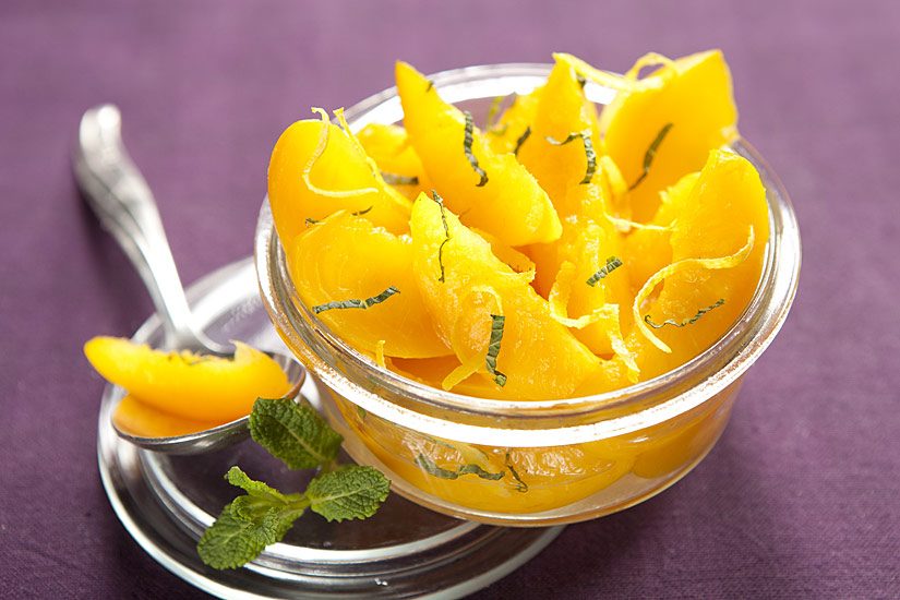 Variante : ce dessert est bien sûr réalisable avec des nectarines qui peuvent être accommodées comme dans la recette ou parfumées de mélisse ou de verveine fraîche ciselée en remplacement de la menthe.