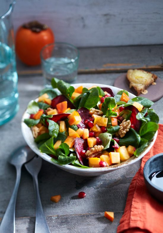 - Monter les assiettes en disposant les ingrédients harmonieusement : mâche, betterave, kaki, grenade, noix puis arroser d’un filet de vinaigrette à l’huile de noix.