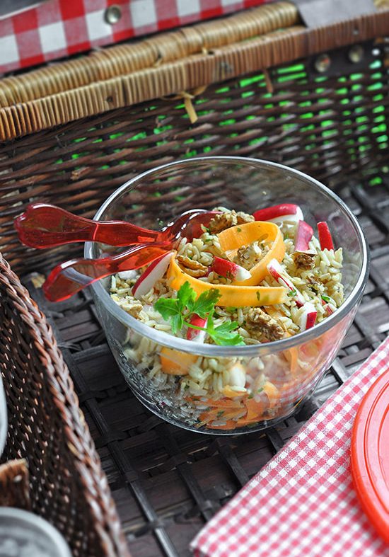- Dans un saladier, mélanger les carottes râpées, les rondelles de radis, le riz, le persil ciselé et les morceaux de noix.