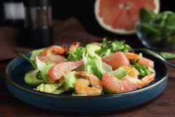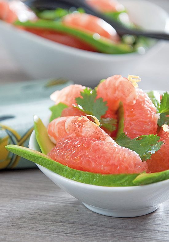 Salade pomelo-avocat, coriandre fraîche et crevettes roses