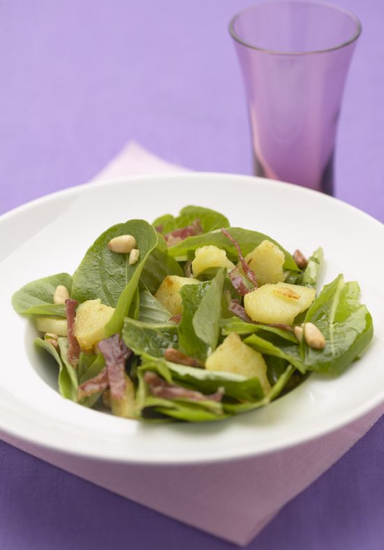 - Arrosez d'huile de noix et couvrez avec les pommes de terre rissolées et la pancetta croustillante. Savourez sans attendre !