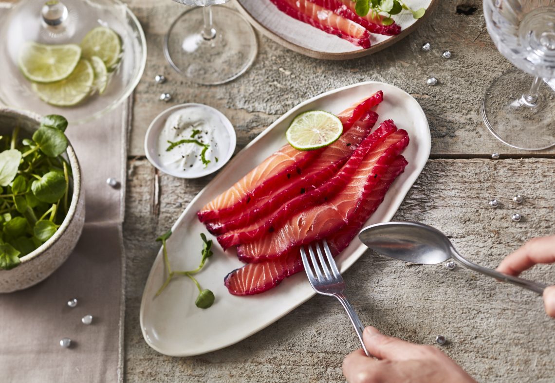 Saumon gravelax à la betterave, cresson, zestes de combava