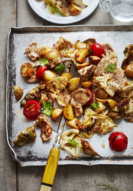 - Laver, éplucher (si nécessaire) et tailler les pommes de terre en quartiers. Tailler le fenouil en lanières très fines à l’aide d’une mandoline. Couper les artichauts en deux ou quatre dans la hauteur (selon le calibre). Laver et couper les tomates en deux.