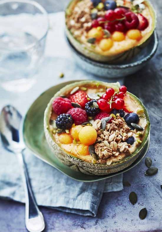 - Verser le smoothie melon abricot pêche dans les coques de melon. Garnir le smoothie de fruits rouges et de muesli, de graines de courges et de pistaches, et ajouter les billes de melon en finition.