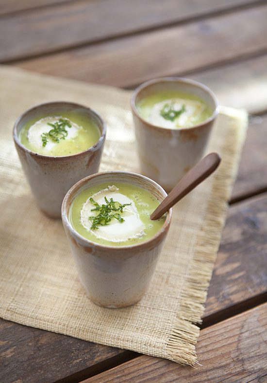 - Servir très frais décoré de très fines rondelles de fromage de chèvre bien sec, de quelques gouttes d'huile d'olive et d'un peu de menthe ciselée.
