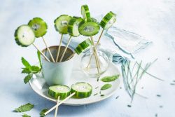 - Piquer le concombre à intervalles réguliers avec les pics à brochette en prenant soin de planter le pic jusqu’au bout (mais sans percer complètement la chair du concombre).