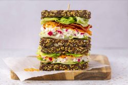 - Parez les bords du sandwich en éliminant au couteau la salade ou le bacon qui dépassent.