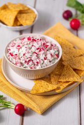 - Dans un bol, mélanger la chair de radis noir avec les petits suisses, la ciboulette ciselée, les radis roses et le sel.