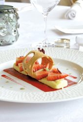 - Montage : dans le fond d’une assiette, déposer un fond de gelée de fraises. Le garnir de crème au citron (en laissant apparaître la gelée de fraise). Disposer sur la crème au citron des morceaux de fraise et décorer avec le cercle de pâte sablée à la poudre d’amandes. Parfumer avec le jus au basilic.