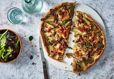 - Déposer les cardons à la crème dans le fond du plat. Garnir de tranches de mozzarella et parsemer de lardons. Saler, poivrer et enfourner la tarte pendant 25 minutes environ jusqu’à ce qu’elle soit bien dorée.