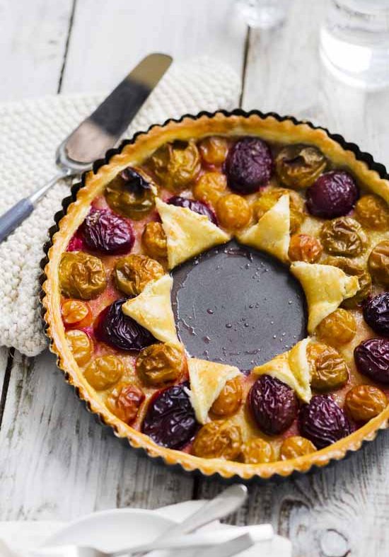 Saupoudrer de poudre d’amande et placer les demi-prunes sur le fond de la tarte. Retirer le bol et découper la pâte restée sans fruits en étoile (en partant du centre) de sorte à pouvoir rabattre les pointes sur les prunes.