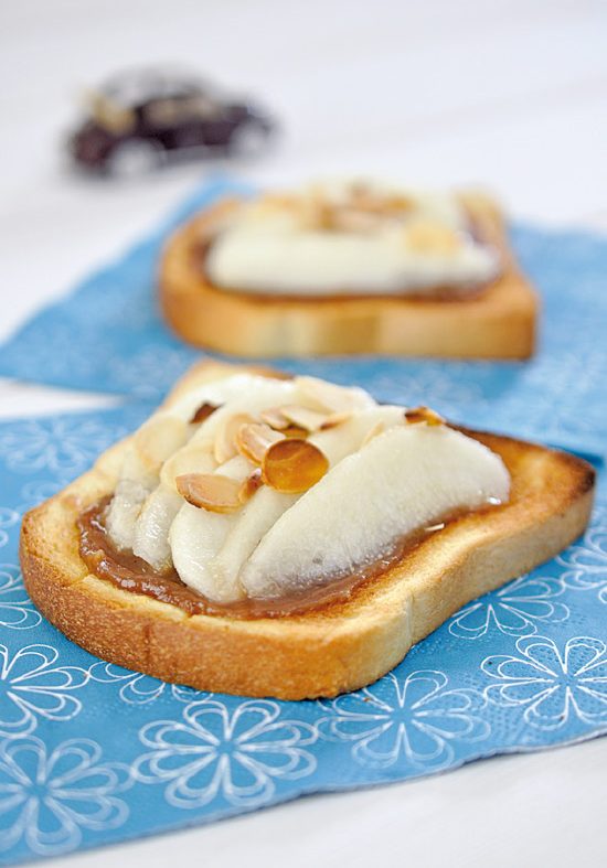 Coupe les tartines en 4 (en triangle ou en carré) puis parsème d’amandes effilées grillées.