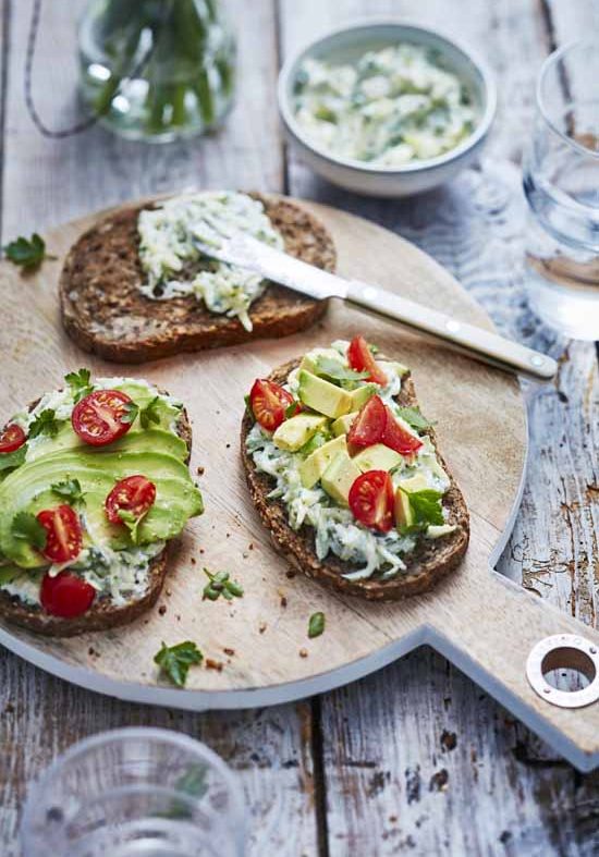 • Tartiner chaque tranche de pain de tatziki courgette-concombre. Ajouter quelques morceaux d’avocat et des tomates cerise.