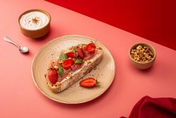 Tartines salées fraises, jambon cru, labneh et dukkah
