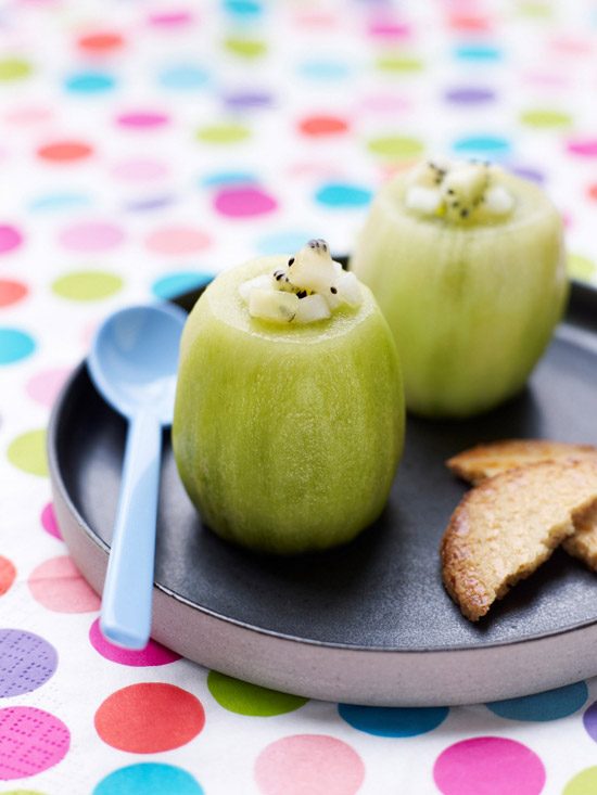 - Coupe chaque extrémité des kiwis pour qu’ils ressemblent à des petits tonneaux. Pèle-les à l’économe. Creuse-les à la cuillère en faisant attention à garder la forme du fruit. Taille la chair du kiwi que tu as enlevé en petits dés.