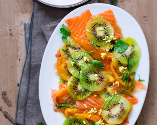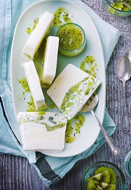 - Garnis les timbales de kiwis de crème pâtissière jusqu’à mi-hauteur, finis de les remplir avec les kiwis et les poires coupés en dés. Place chaque timbale sur un petit sablé, au centre d’une assiette. Croque et craque !
