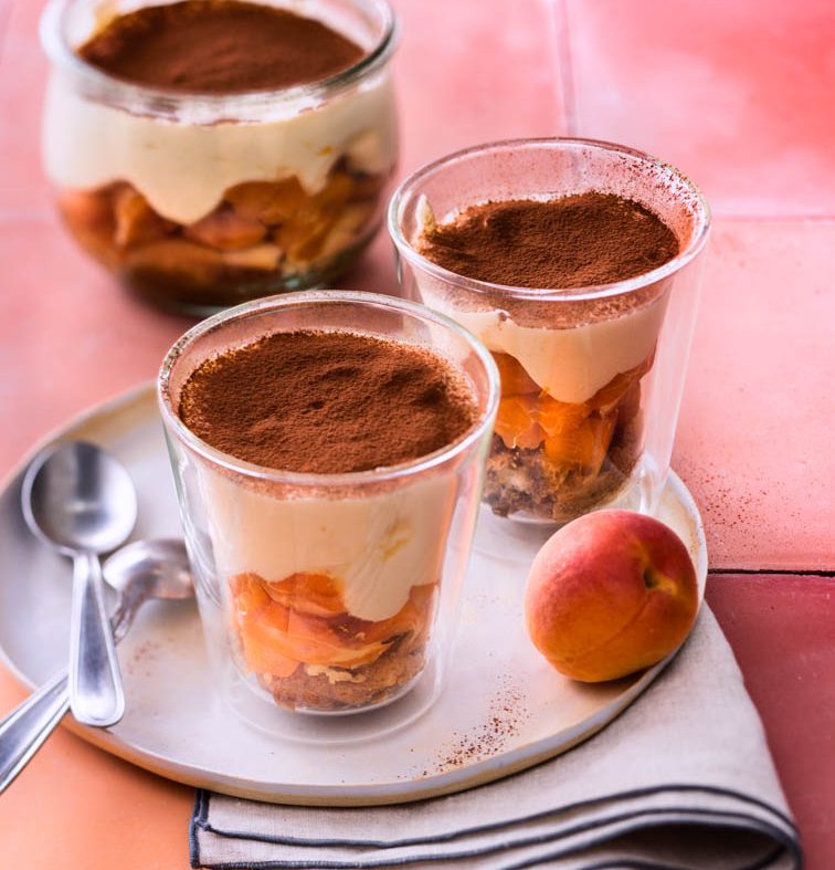 - Mélanger le café froid et le marsala dans une assiette creuse. Tremper rapidement les biscuits à la cuillère dans ce mélange. Tapisser le fond des verrines d’une couche de biscuits imbibés. Recouvrir de morceaux d’abricots. Ajouter quelques feuilles de menthe (ciselée ou non).