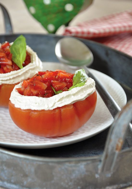 - Décalotter les tomates au tiers. Les évider puis les garnir avec les fraises.
