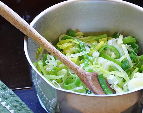 • Dans une casserole, mettre le beurre à fondre et ajouter les poireaux coupés. Les laisser « fondre » quelques minutes à feu doux.