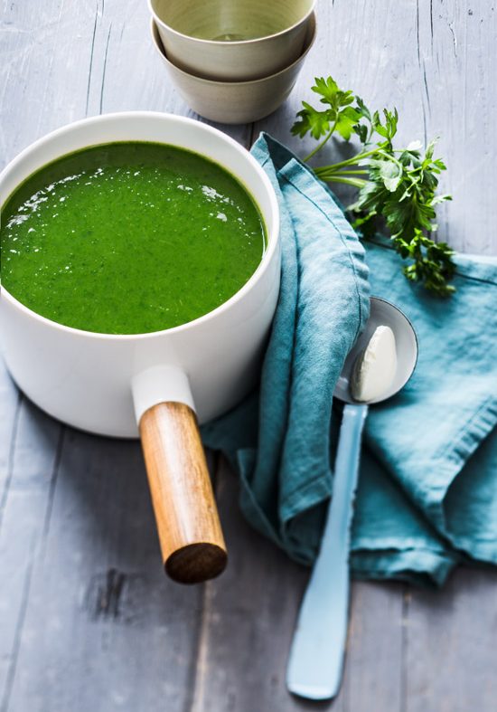 Laver le persil puis le ciseler grossièrement. Dans une grande casserole, déposer le beurre et faire « tomber » le persil (c’est-à-dire, le faire réduire en volume en remuant de temps en temps).