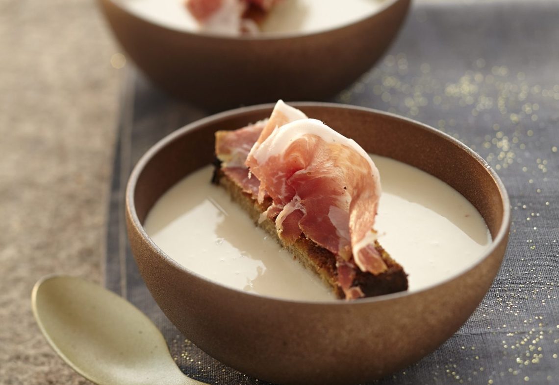 Une fois les topinambours cuits, déposez-les dans la cuve d’un mixeur avec la crème liquide. Mixez et ajoutez la quantité de bouillon de jambon suffisante pour obtenir un velouté onctueux.