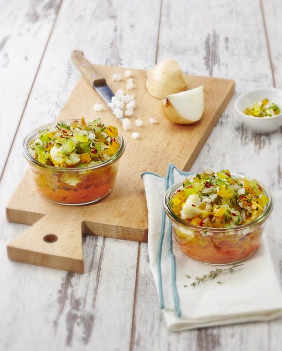 - Réchauffer la purée et la déposer dans chaque verrine, répartir le poisson et napper de rougail. Servir aussitôt.