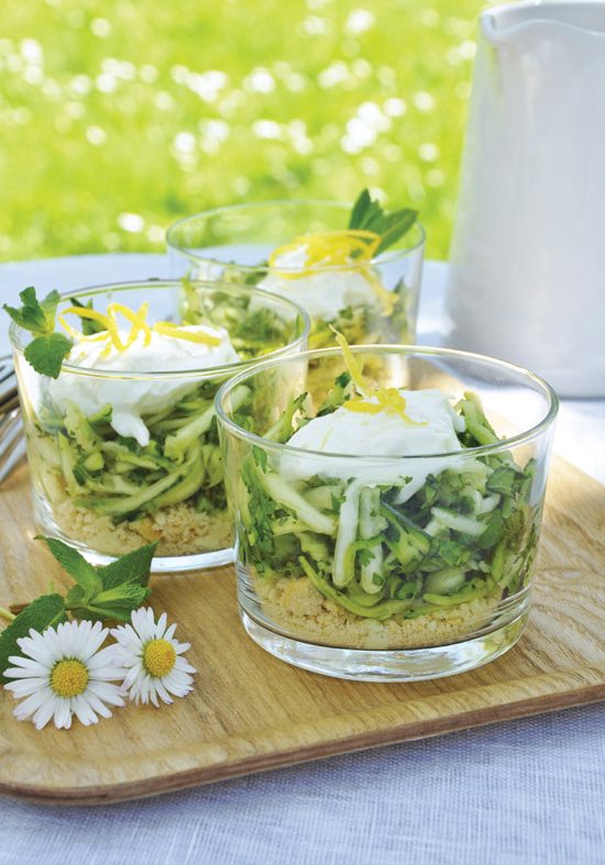 - Dans un bol, déposer les petits suisses. Saler puis incorporer les zestes de citron. Répartir les biscuits écrasés dans des verrines puis répartir dessus la salade aux herbes et terminer par une cuillerée de petit suisse aux zestes de citron.